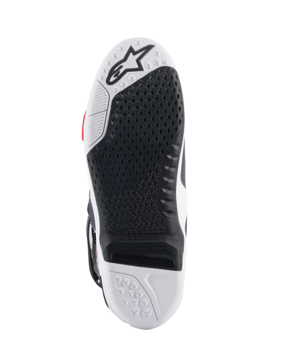 A bota tem uma flexibilidade incrível graças à Frontal Flex Frame (zona flexível patenteada pela Alpinestars), que combina placas de ligação frontais e traseiras, desde o pé até à canela, um sistema de ligação com TPU de duas densidades entre as fivelas e o exterior da bota, e é complementada por um sistema de duplo pivot que elimina a necessidade de ter várias barras de torsão. A Frontal Flex Frame move-se facilmente entre a parte superior e inferior da bota, prevenindo compressão excessiva e distensões.